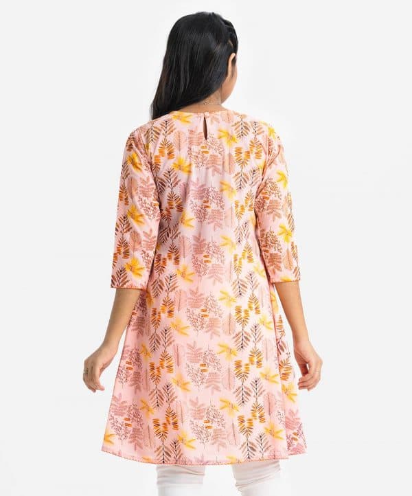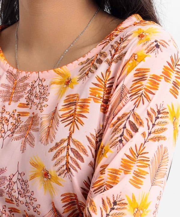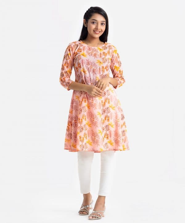 Teen girls floral printed A-line tunic in georgette fabric. Round neck, three-quarter sleeves, and sequence work at the front.