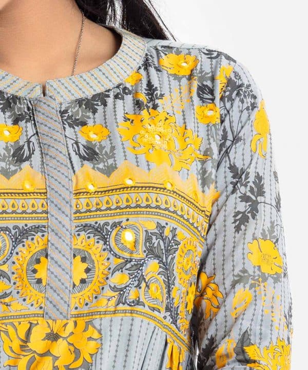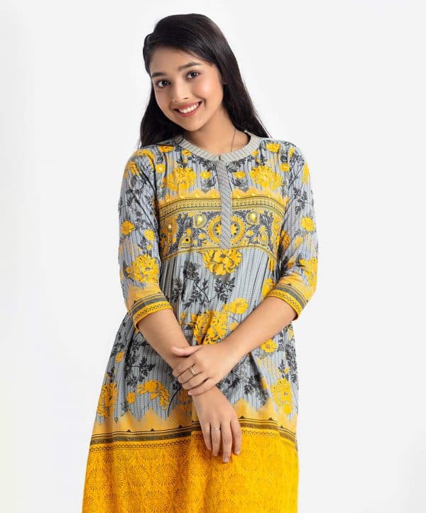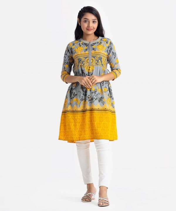 Teen Girl’s floral printed A-line tunic in viscose fabric. Stand collar with placket, three-quarter sleeves. Pleated waistline and karchupi at front.