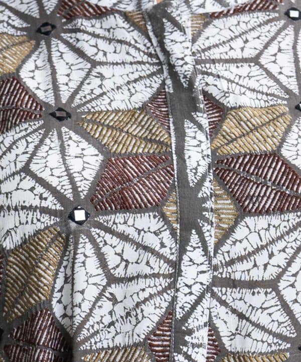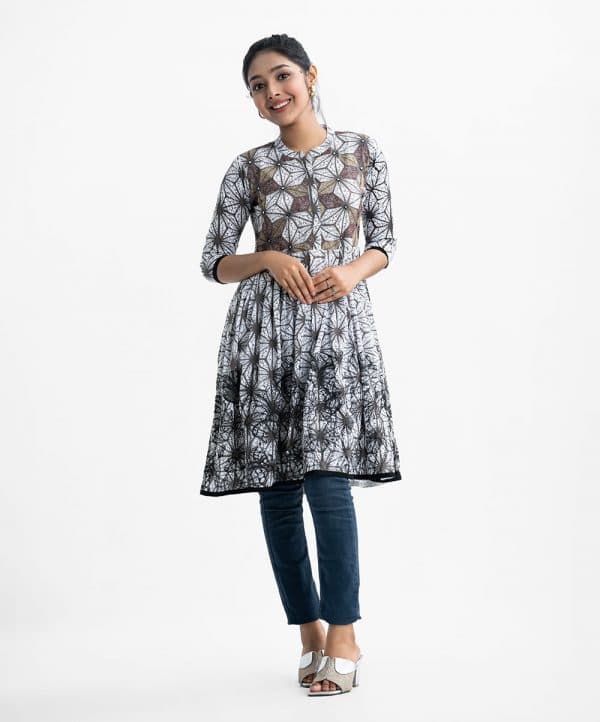 Teen girl printed A-line tunic in viscose fabric. Stand collar, three-quarter sleeved. Gathered at the waistline and embroidery at the front.