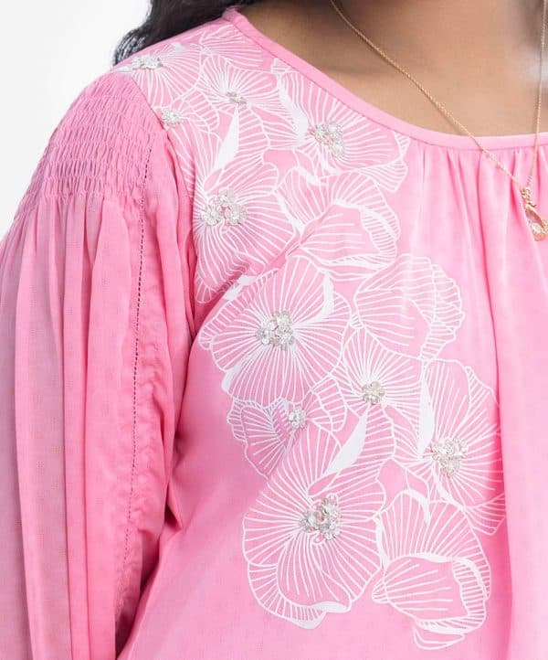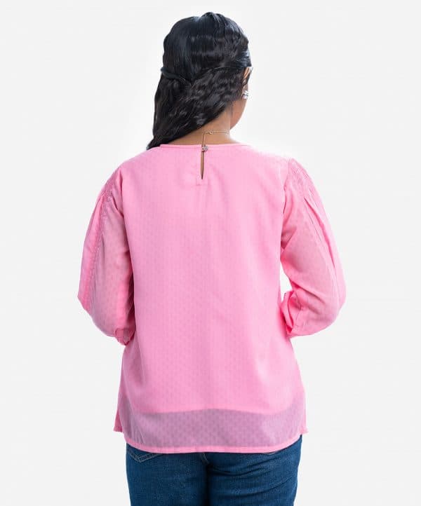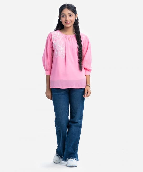 Teen girl top in georgette fabric with crepe inner. Round neck,three quarter button cuff sleeves with smoky design and karchupi at front.