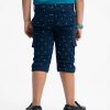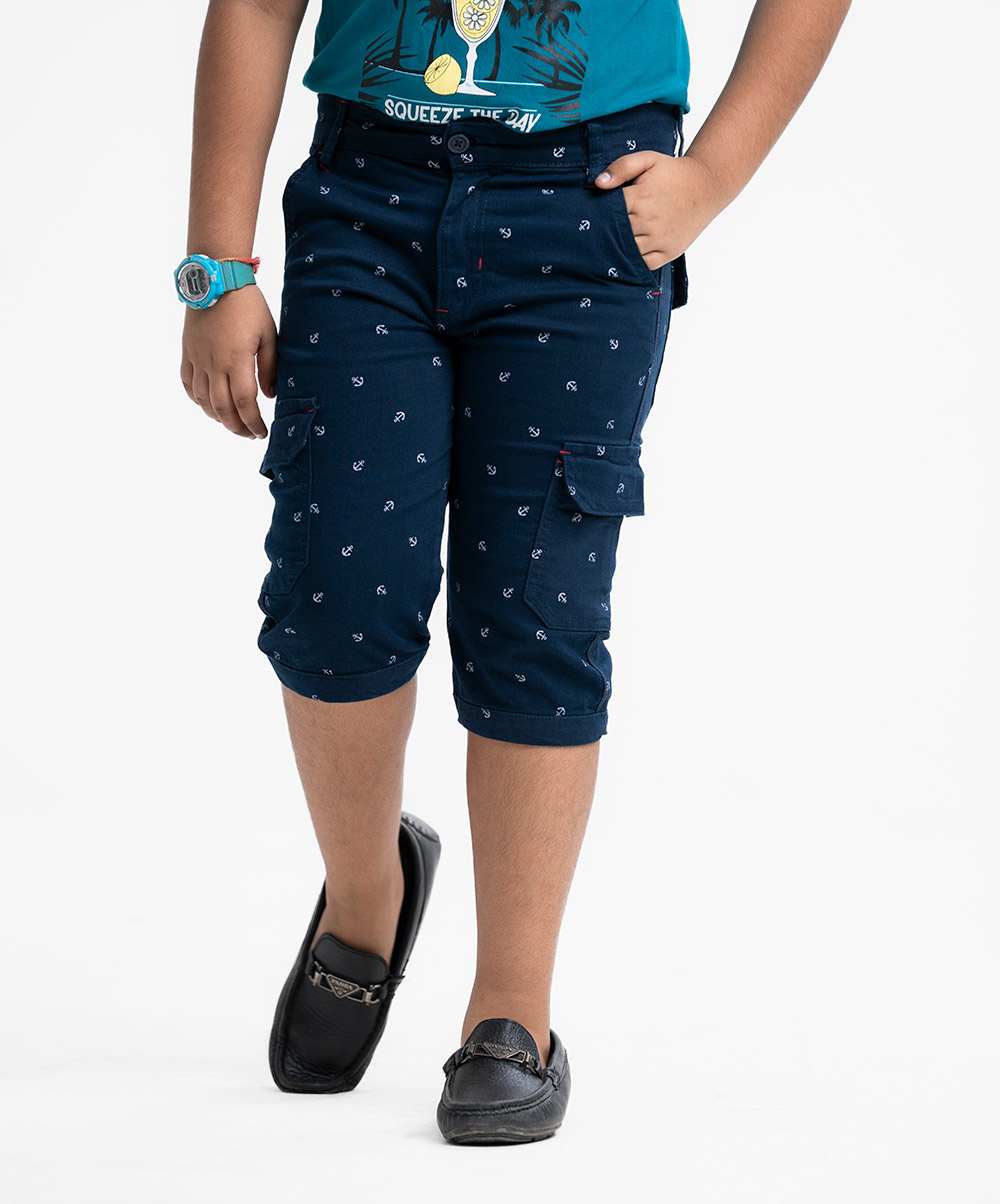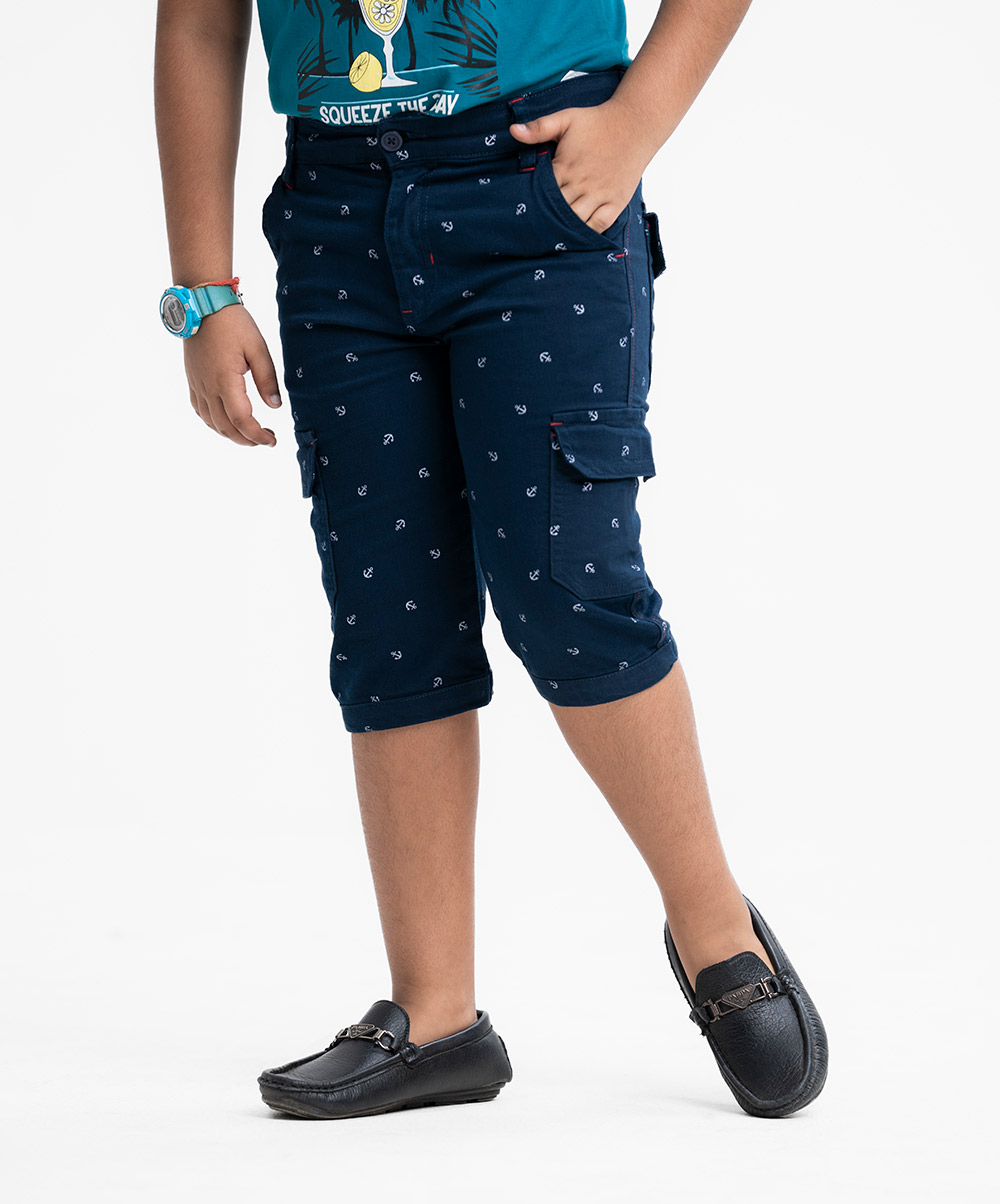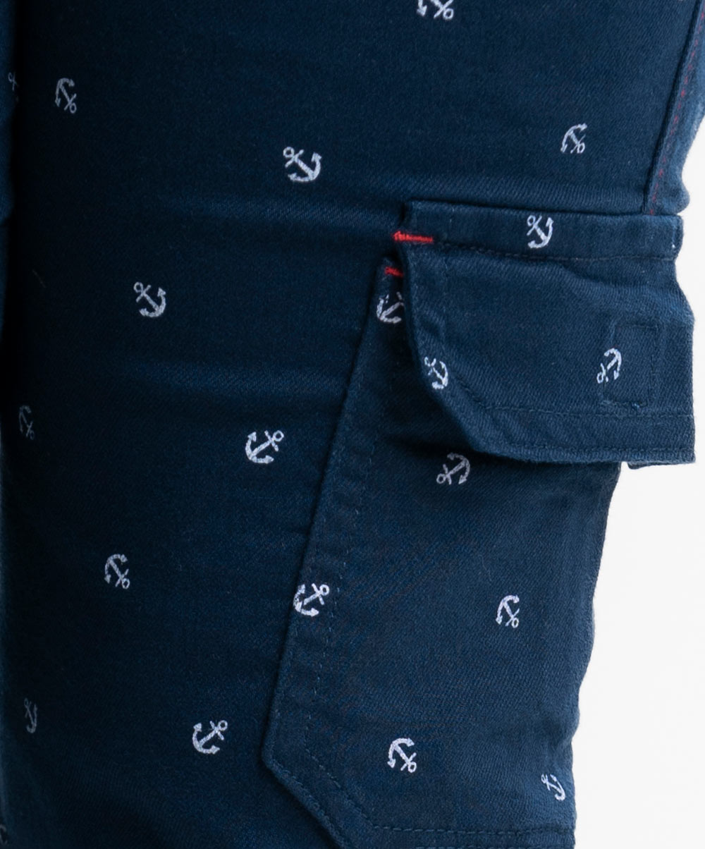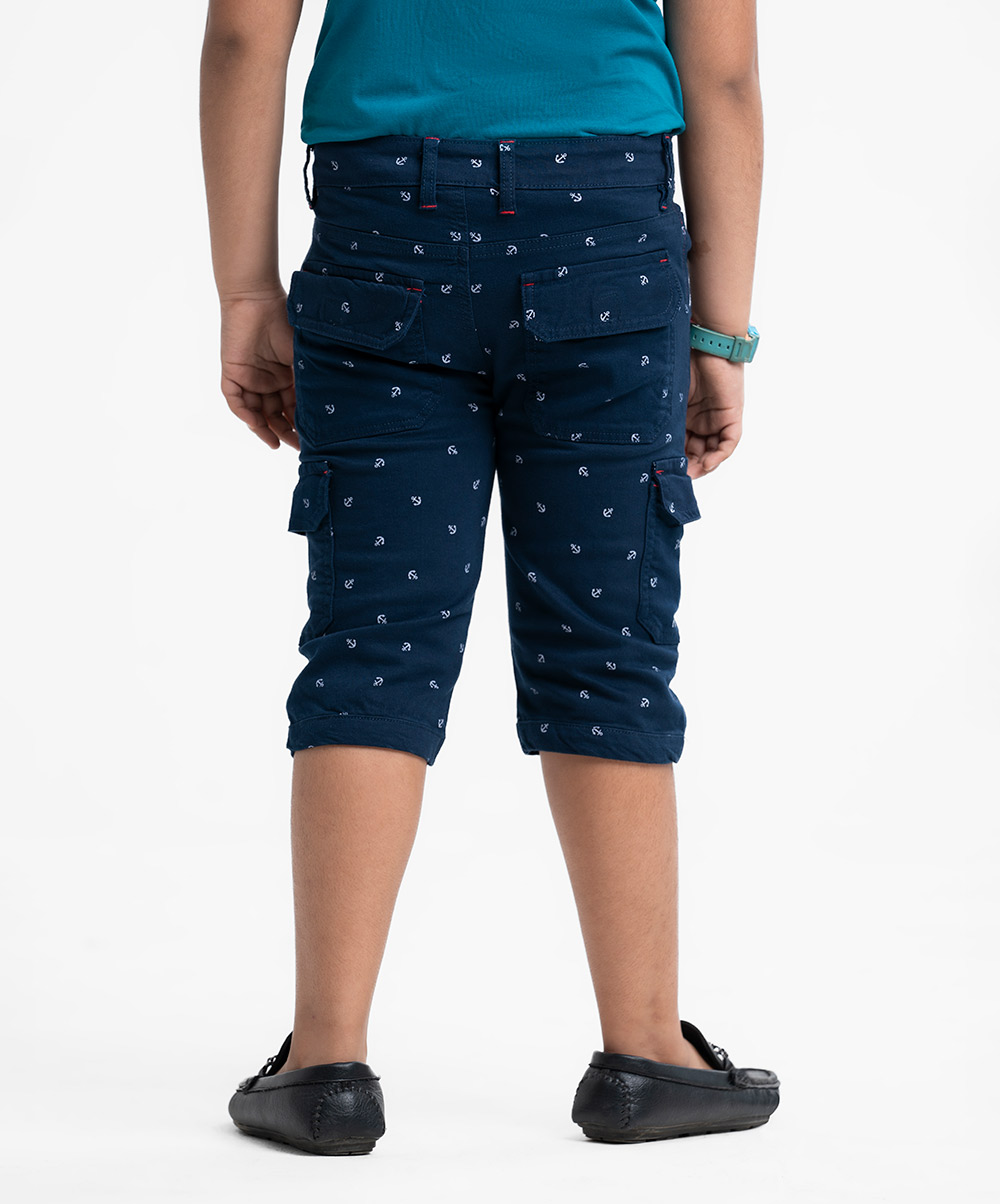 Kid boys’ printed three-quarter pants in twill fabric. Zipper fly and a button fastening at the front. Two side pockets and two patch pockets on the back.