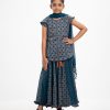 Kid girls printed A-line ghagra choli set in joom fabric. Cap sleeved top with embroidery at front. Tie-dye chiffon dupatta with pleated and frill hem skirt.