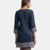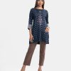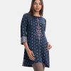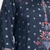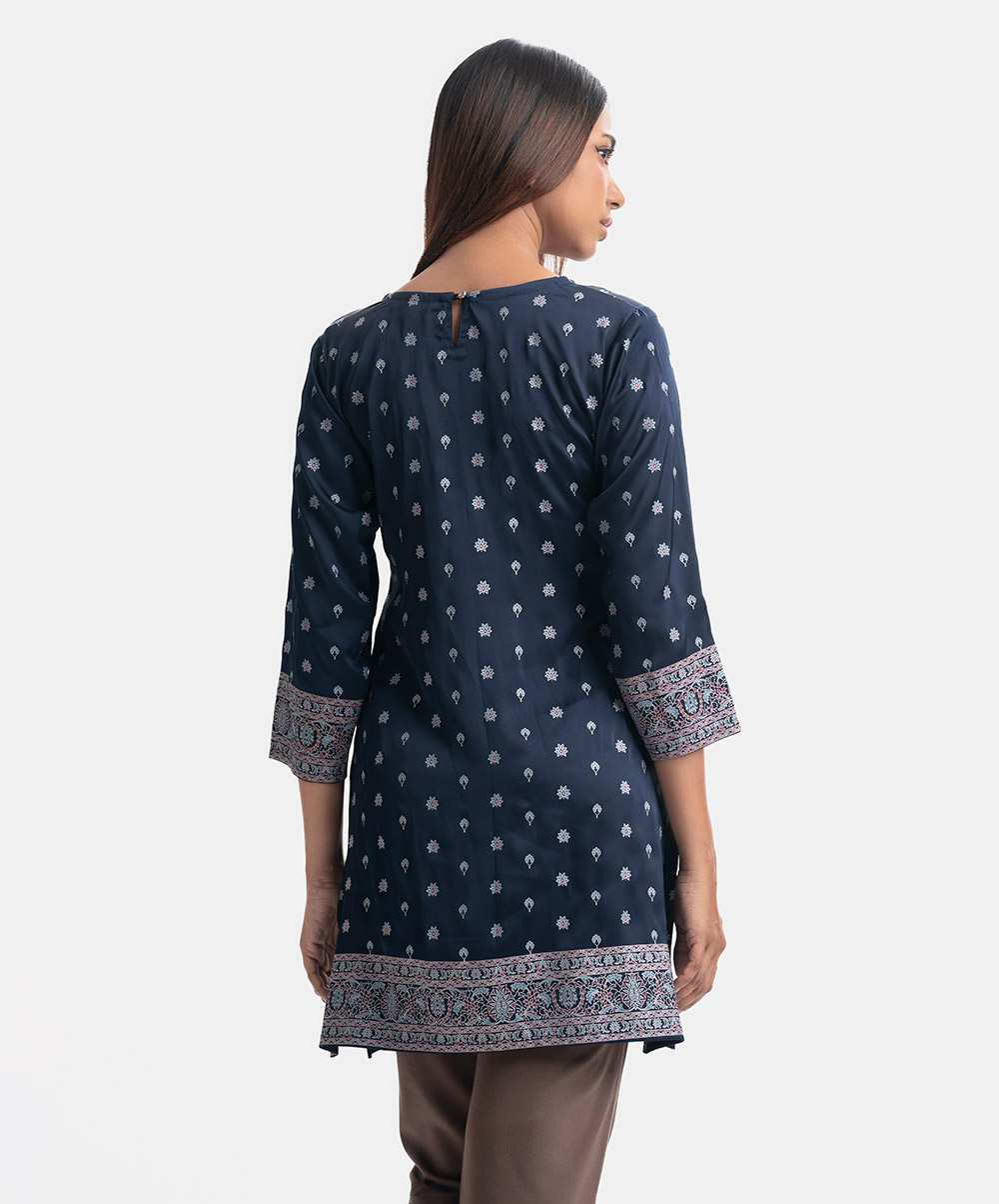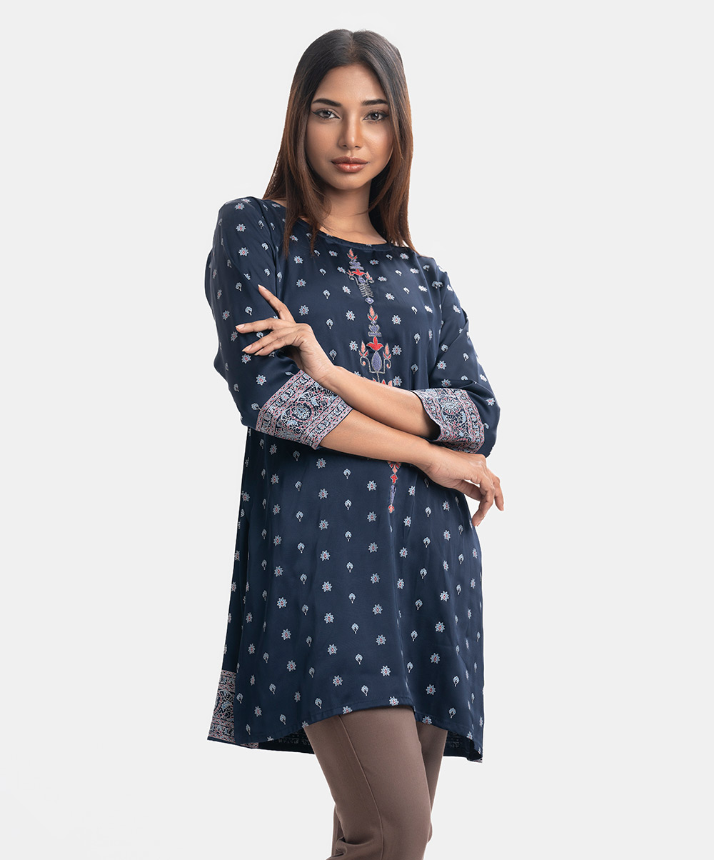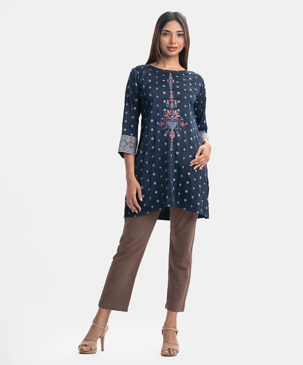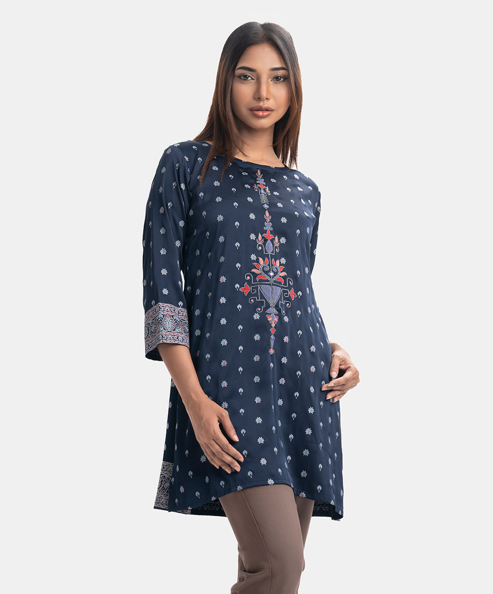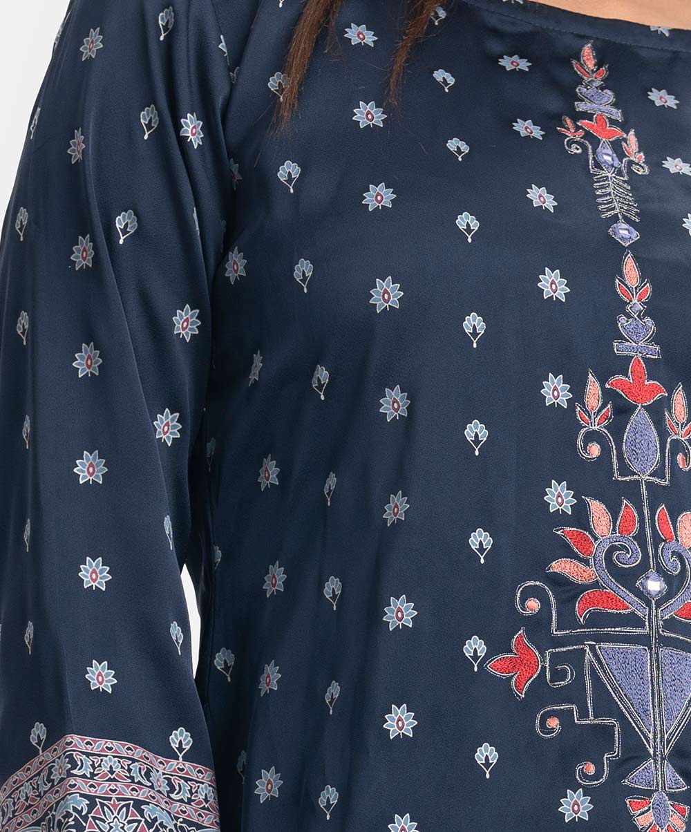 Round-neck A-line kameez in satin-georgette fabric. Three-quarter sleeves. Karchupi and embroidery detailed.